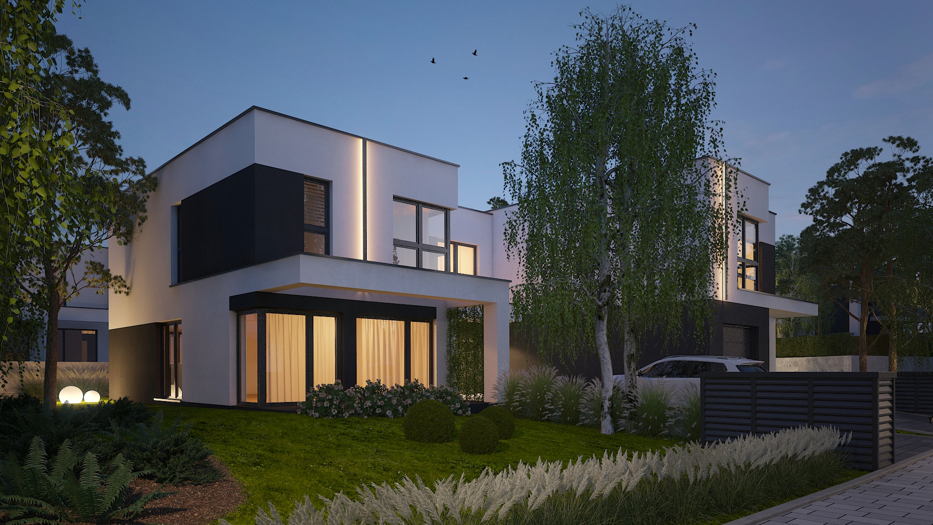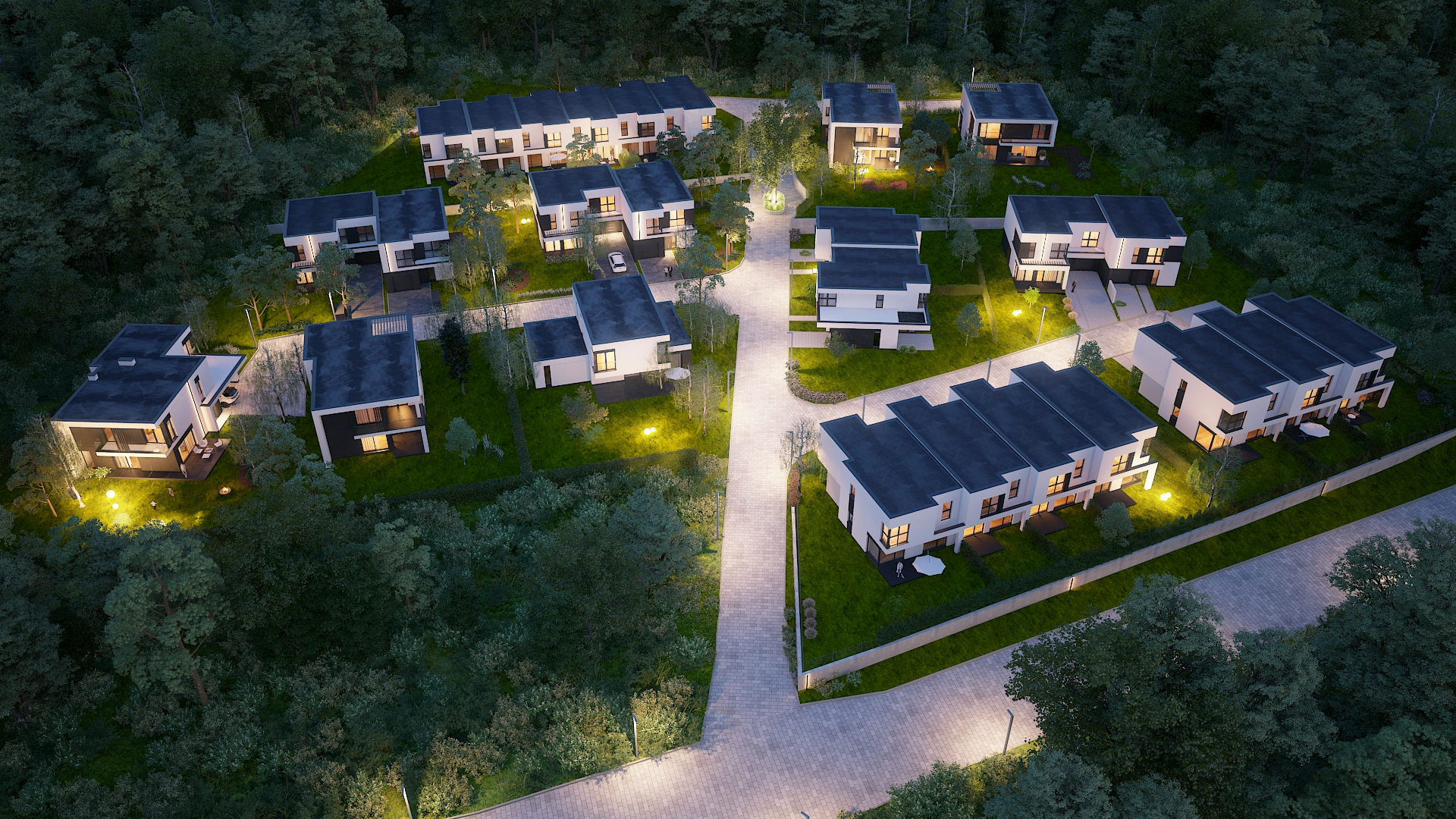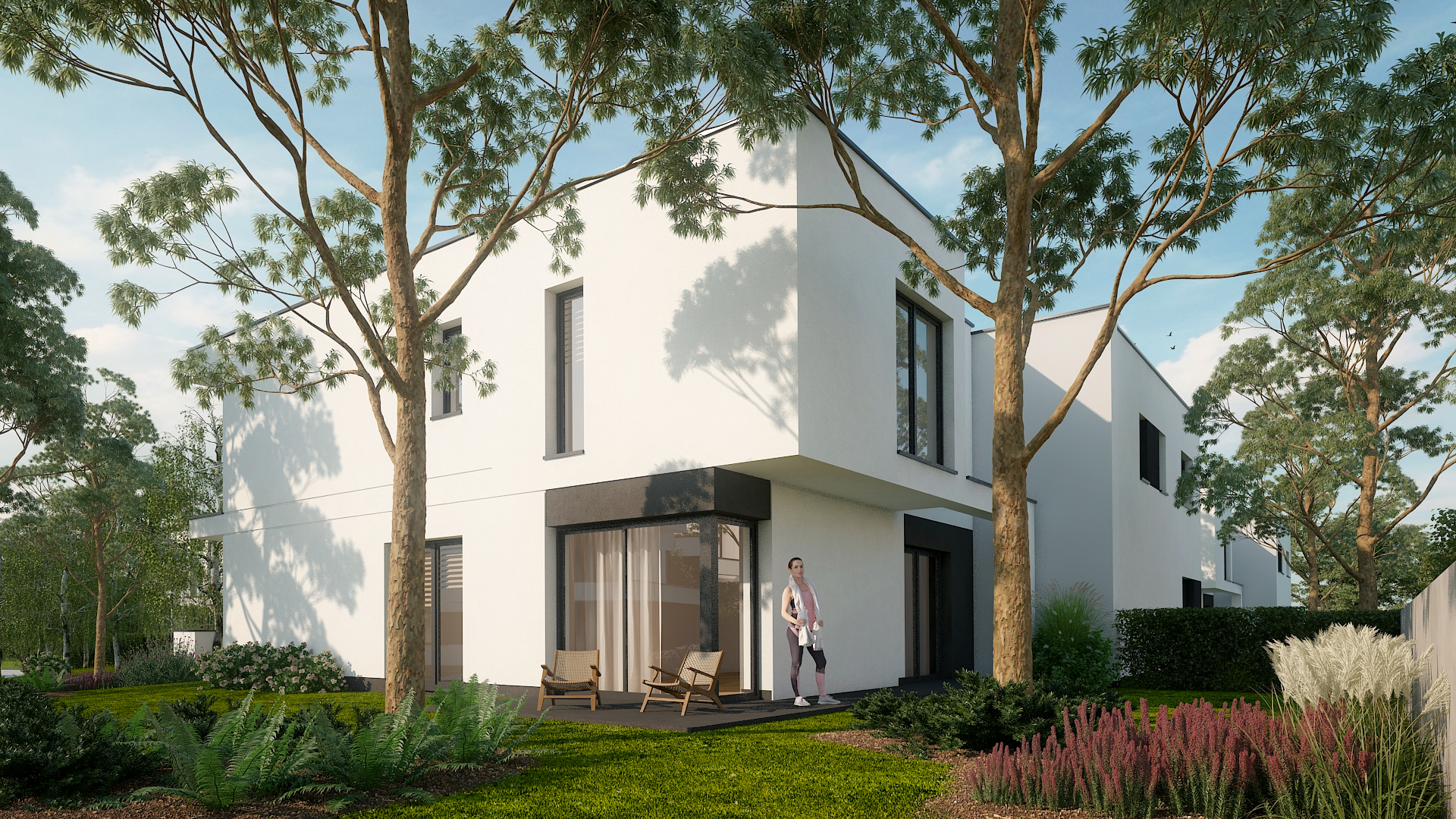 Dodajmy do tego wysublimowane wzornictwo, rozkłady pozwalające mieszkać niezwykle wygodnie oraz  bardzo duże przeszklenia, a tworzy nam się obraz miejsca niezwykłego. Przewidzieliśmy również całościowe ogrzewanie podłogowe w każdym z domów, a także pompy ciepła jako źródło ogrzewania, czyli większe bezpieczeństwo energetyczne oraz bardziej ekologiczna energia.